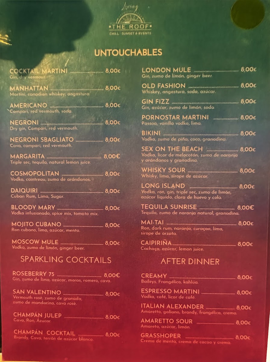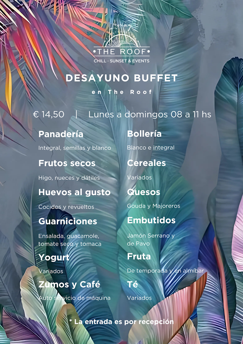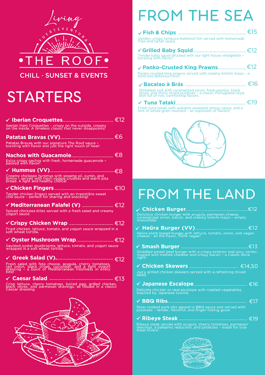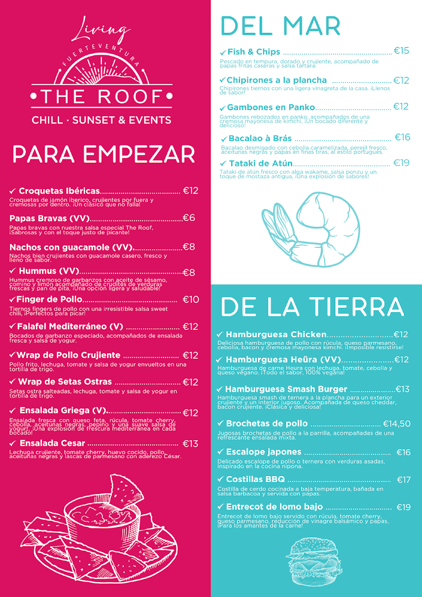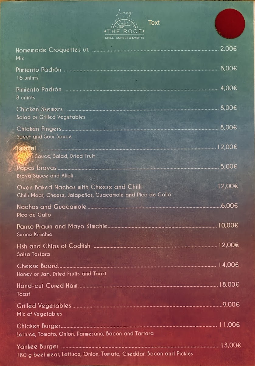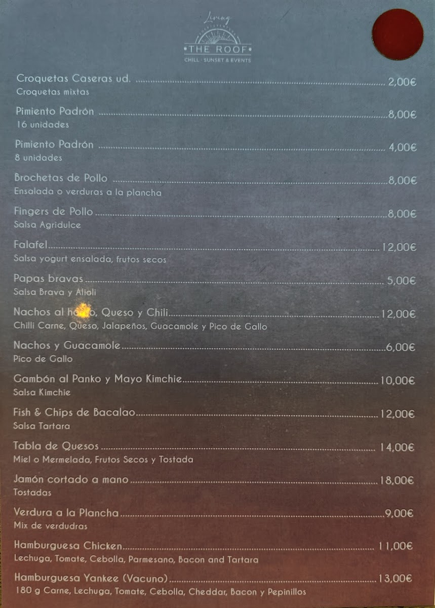 The menu at The Roof Chill Out offers a variety of flavorful options, perfect for any craving. For starters, you can indulge in Croquetas Caseras (6 u), Papas bravas, or Nachos guacamole, with a twist of Nachos al horno con queso y chili. If you're in the mood for seafood, the Gambones en panko is a must-try. When it comes to burgers, the restaurant features options like the Hamburguesa Vegana, Hamburguesa Crispy Chicken, and the mouth-watering Hamburguesa Smash Burger. For those seeking something lighter, the Ensalada Griega and Ensalada Cesar provide fresh and vibrant options to round off the meal. The diverse menu at The Roof Chill Out ensures there is something for everyone, whether you're looking for a hearty meal or a refreshing salad.